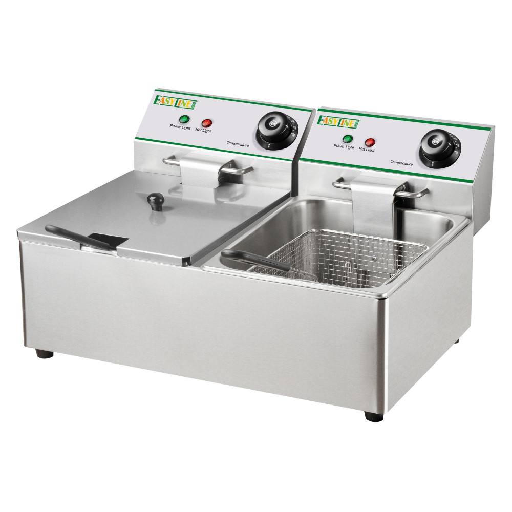 Фритюрниця Fimar Easy Line FY88L на 8+8 літрів призначена для приготування продуктів у великій кількості олії. Картопля фрі, картопля по-селянськи, пончики, котлети по-київськи, страви в паніровці, овочі та фрукти в клярі - все це різноманіття можна приготувати без особливих зусиль за допомогою фритюру та фритюрниці. Фритюрниця Fimar виконана з нержавіючої сталі, висувні кошики — з хромованого дроту, ручки кошиків та кришок — із термоізолюючого пластику, ТЕНи — із нержавіючої сталі. Максимальна робоча температура апарату приготування картоплі-фрі становить 200 °C. Час обсмажування становить близько 6 хвилин. Нагрів від 0 до 200 °C досягається за 7 хвилин. Дана фритюрниця оснащена запобіжним термостатом з кнопкою повернення у вихідний стан, що робить її особливо безпечною та надійною у використанні. Верхній блок та ТЕНи є знімними.