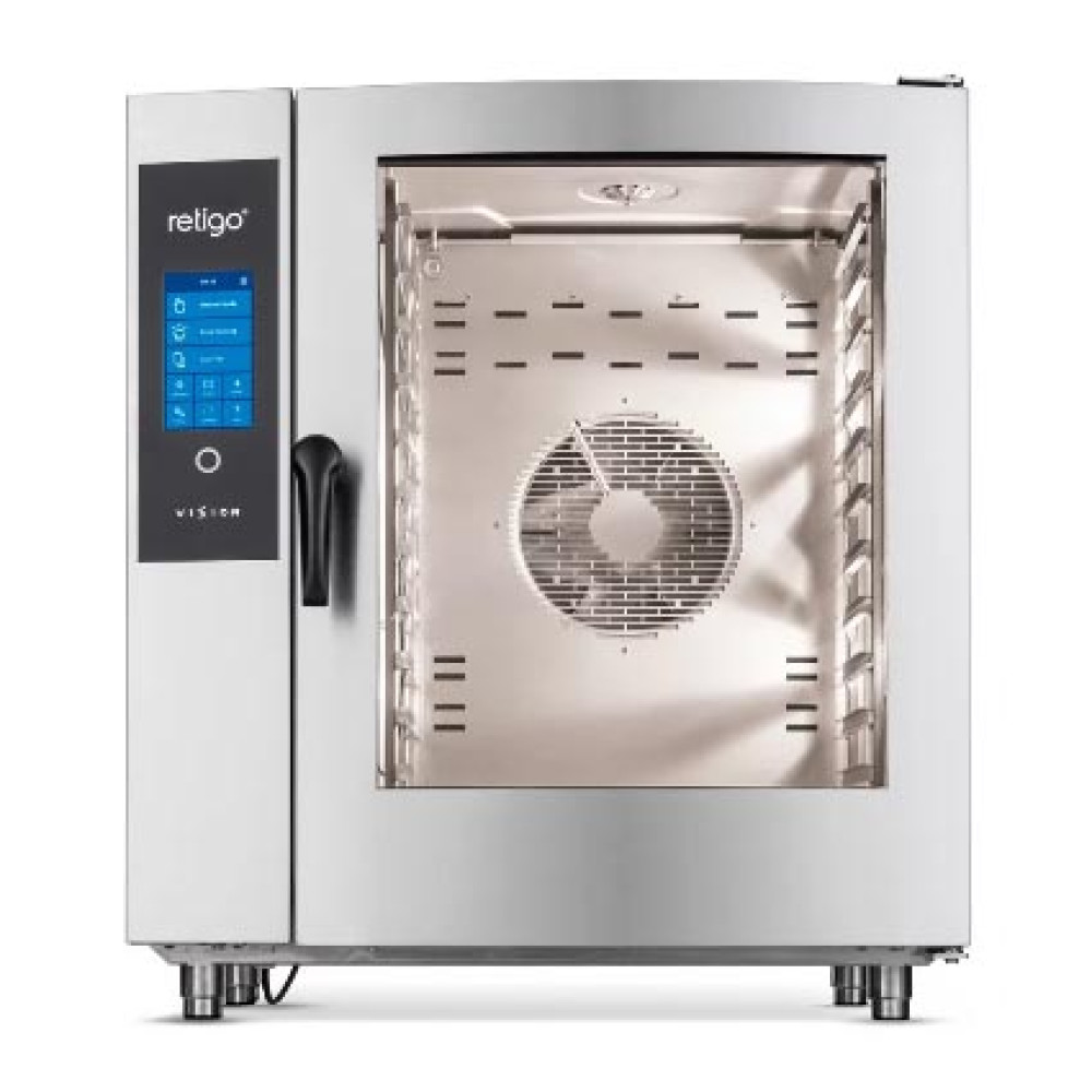 Пароконвектомати Retigo — це поєднання передових технологій, ціни та якості. Кожен пристрій замінює кілька видів теплового обладнання. Це дасть вам змогу спростити роботу персоналу та заощадити споживання ресурсів. Базова конфігурація всіх моделей включає систему автоматичного очищення і режим простого приготування, а також стулковий клапан і шеститочковий термощуп. Серія Blue Vision — це проста сенсорна панель керування, сучасне програмне забезпечення, великий вибір програм і можливість їх додаткового налаштування. Переваги пароконвектоматів Retigo: Технології, що використовуються в пароконвектоматах Retigo, дають змогу зберегти всі корисні властивості ваших страв і надають їм привабливого зовнішнього вигляду. Інтуїтивно зрозуміле і просте управління, з яким легко зможе розібратися персонал вашого закладу. Також пристрої оснащені чутливим сенсорним дисплеєм, який реагує навіть якщо ви в рукавичках. У кожному пароконвектоматі вбудована автоматична мийка. А також теплообмінник і дверцята з потрійним склінням із термоізоляцією завтовшки 50 мм забезпечують низьке споживання електроенергії та води. Усі пароконвектомати від бренду Retigo - це лаконічний, функціональний та ергономічний дизайн. Стандартне оснащення: Температурні режими: Гаряче повітря: 30 – 300 °C; Комбінований режим 30 – 300 °C; Приготування на пару 30 – 130 °C; BIO приготування 30 – 98 °C. Приготування страв: Нічне приготування; По рівневий контроль — налаштування часу для рівнів; AHC (Active Humidity Control) — автоматичне регулювання вологості; Опрацьована система пароутворення — двоступеневий підігрів води і рекуперації; Горизонтальне завантаження; Дельта T варіння — точність при приготуванні великих шматків; Низькотемпературне варіння; Cook & Hold - після закінчення варіння автоматичний перехід у фазу збереження; Golden Touch - ідеальний колір і хрустка скоринка; Автоматичний підігрів/охолодження варильної камери з налаштуванням; Спеціальні програми — Су-від, Сушка, Стерилізація, Конфі, Копчення. Система регенерації/банкетна система — готуйте, охолоджуйте та застосовуйте регенерацію, для того, щоб обслуговувати більшу кількість гостей; Окремі таймери для полиць — встановлюйте окремий час приготування для кожної полиці, щоб прискорити процес приготування кожної страви; Приготування та утримання — підтримуйте необхідну температуру страви до подачі. Програмне забезпечення “My Vision Controls” Розмір дисплея — 8". MyVision — налаштування відбору необхідних функцій. Сенсорна панель — без механічних елементів і кнопок. Easy Cooking — пристрій підбирає і рекомендує відповідну програму для необхідного результату. 6-ти точковий температурний щуп — для точного контролю температури. Понад 1000 програм у базі пристрою з поетапним розподілом. У кожній програмі 20 етапів. Піктограми — підбір позначень під функції. Функція Learn — збереження програми з індивідуальними налаштуваннями. 10 останніх — перегляд 10 останніх процесів. Multitasking - налаштування роботи дисплея під час роботи програми. Автоматичний запуск — відкладений запуск пристрою. EcoLogic — дані про споживання електроенергії для кожного процесу приготування виводяться на дисплей. Безлімітний час приготування — економія часу під час приготування. Інше обладнання: Active Cleaning — автоматична мийка. Дверцята з потрійним склом — мінімальні втрати тепла, низьке ене
