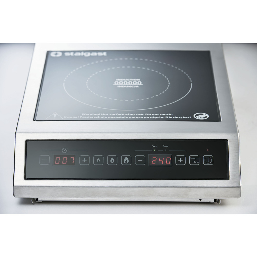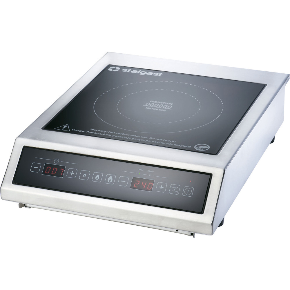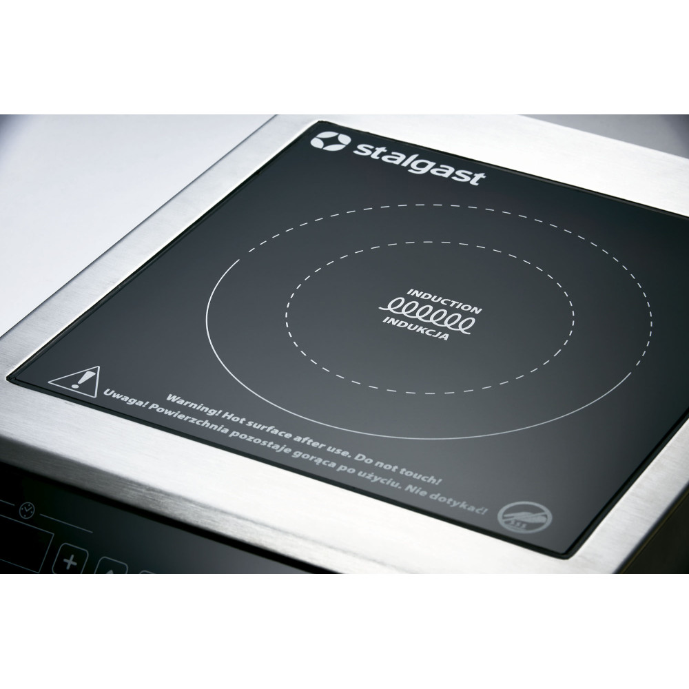 Індукційна плита Stalgast 770351 призначена для використання в напівпрофесійних умовах, з невеликими навантаженнями. Зовні індукційна варильна панель нічим не відрізняється від схожої на неї звичайної теплової склокерамічної електроплити. Принципова відмінність полягає в тому, що у звичайній конфорці тепло виділяється нагрівальним елементом і через склокерамічну поверхню плити передається каструлі.  В індукційній плиті нагрівальний елемент відсутній взагалі: тепло генерується в самому дні посуду під впливом електромагнітного поля, яке створюється за допомогою спеціальної котушки індуктивності. Завдяки найкоротшому шляху перетворення електричної енергії в теплову, індукційні плити мають ряд переваг у порівнянні зі своїми конкурентками: вони швидко нагріваються, а енергії витрачають менше.  Для індукційної плити підійдуть: сталевий та сталевий емальований посуд, чавунний посуд, посуд з нержавіючої сталі з феромагнітним дном та алюмінієвий посуд з феромагнітним дном. Не підходить посуд, виготовлений з алюмінію, міді, латуні, нержавіючої сталі, скла, кераміки або фарфору. Індукційні варильні панелі легко чистити. На звичайних склокерамічних конфорках розлита рідина пригорає. З індукційною конфоркою все набагато простіше: пролита рідина не пригоряє, очищати варильну панель можна відразу, причому, щоб видалити, наприклад, молоко, що втекло, досить звичайної серветки.  Корпус виконаний з нержавіючої сталі, склокераміка, робота в режимі рівнів потужності або режимі температури (C°), індукційна частина поверхні Ø 140 - 260 мм.